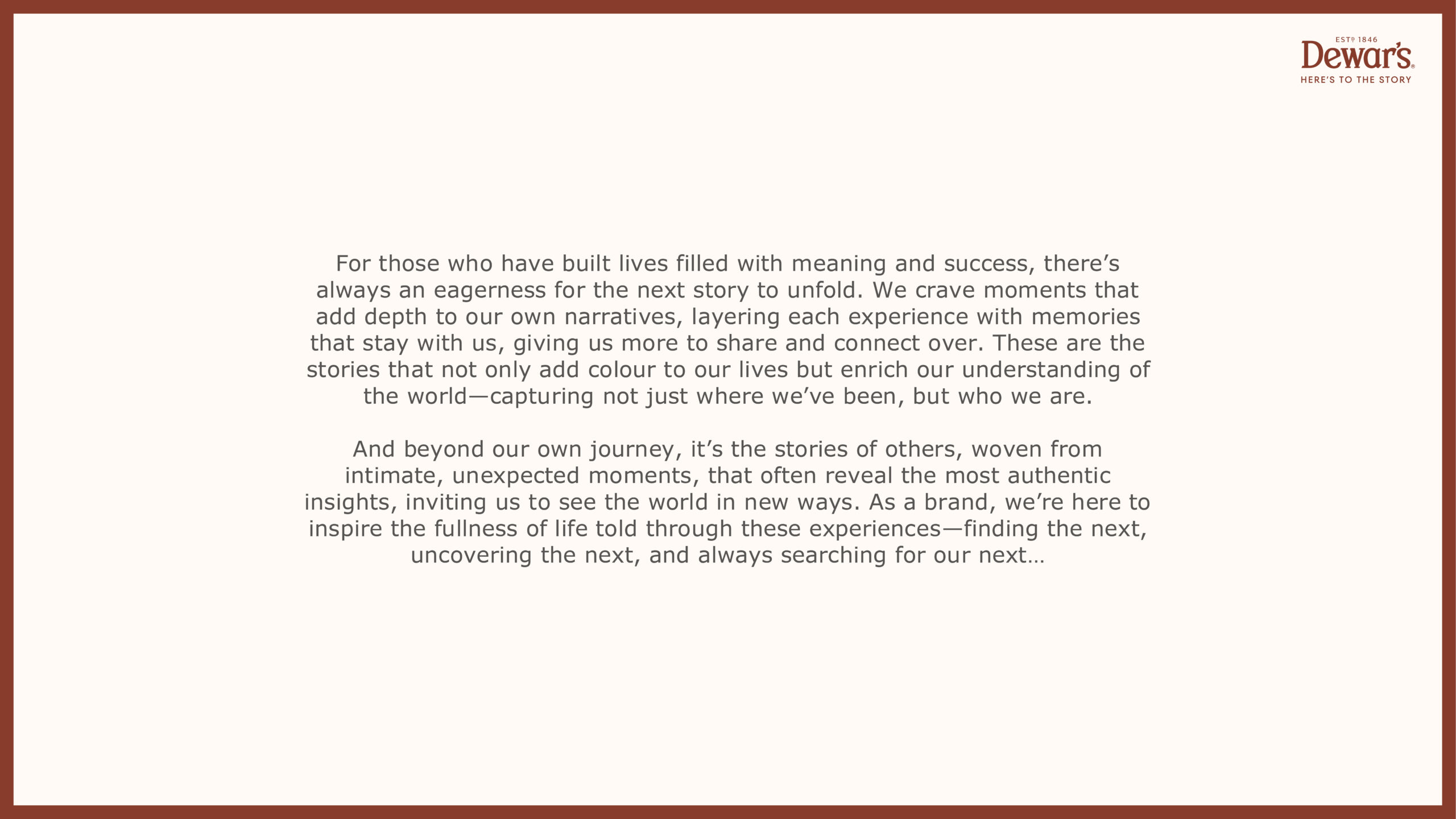 Dewar’s faced a gap in recognition and emotional resonance. New global positioning Here’s to the Story seeks to transform a premium product into a brand.